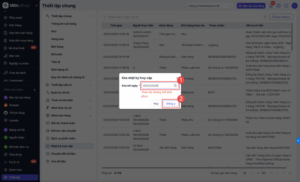 - Nhập thời gian các bản ghi sẽ bị xóa, sau đó nhấn Đồng ý → Hệ thống sẽ xoá toàn bộ bản ghi nhật ký truy cập phát sinh đến ngày đã chọn.