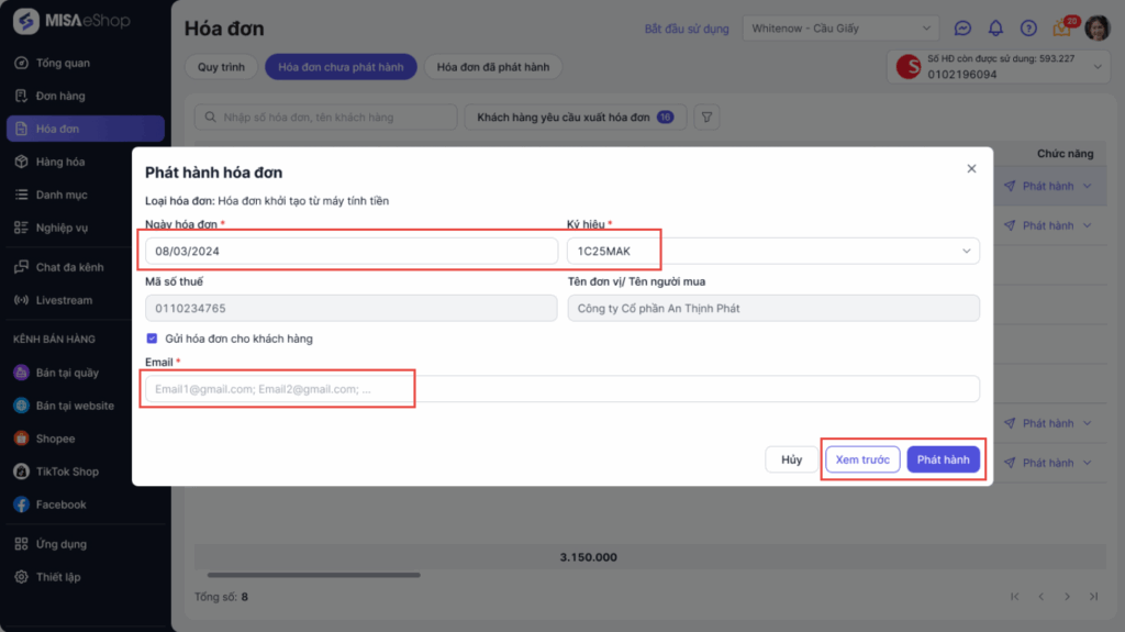 - Nhấn Xem trước để xem trước mẫu hóa đơn