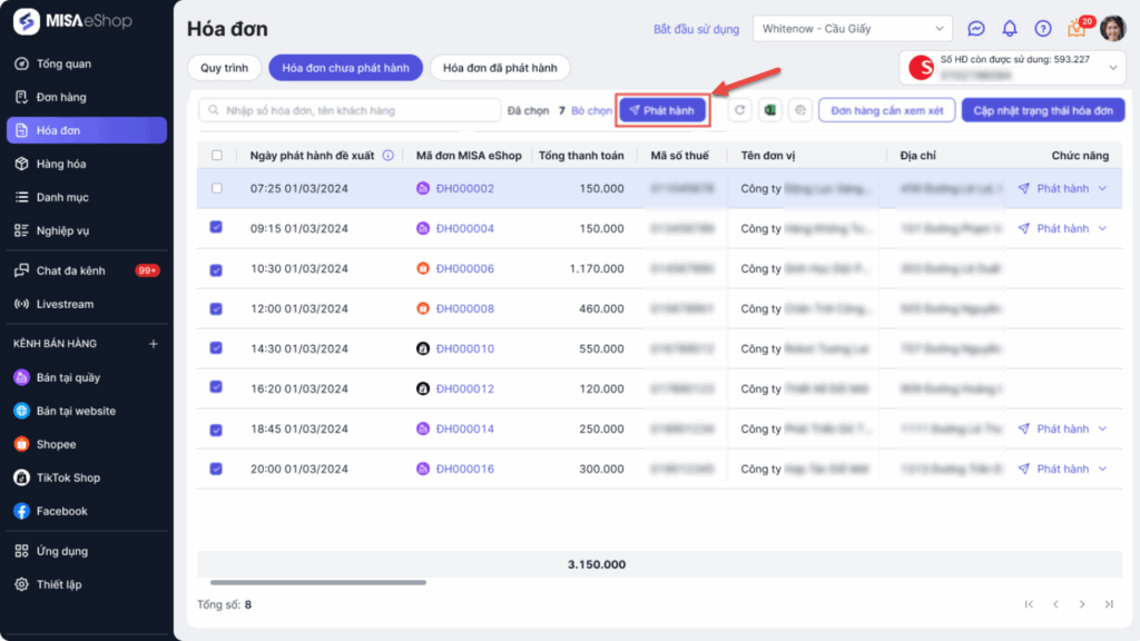- Tích chọn các hóa đơn cần phát hành → Nhấn Phát hành