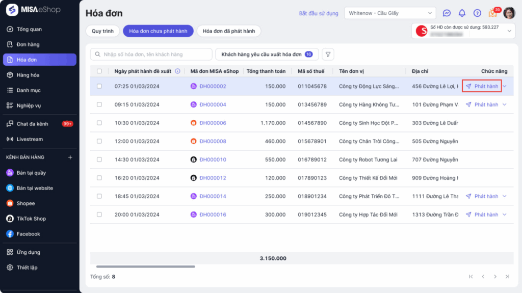 - Tìm kiếm hóa đơn cần phát hành → Tại cột chức năng, nhấn Phát hành.