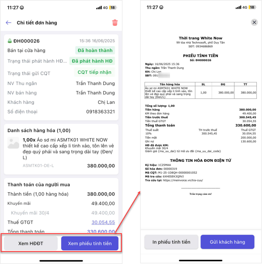 • Có thể xem lại hóa đơn và phiếu tính tiền bất cứ lúc nào tại màn hình chi tiết đơn hàng.