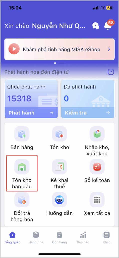 Bước 1: Tại màn hình tổng quan, chọn Tồn kho ban đầu