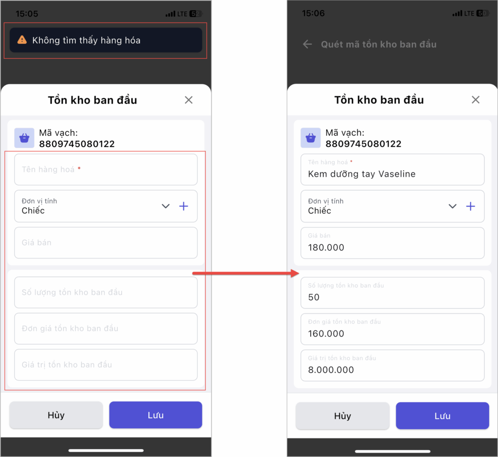 Hệ thống ghi nhận mã vạch vừa quét được. Người dùng khai báo bổ sung: