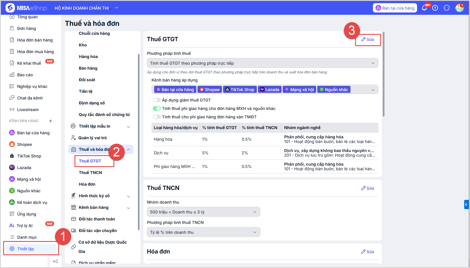 Tại màn hình Tổng quan, truy cập trang Thiết lập\Thuế GTGT, chọn Sửa.