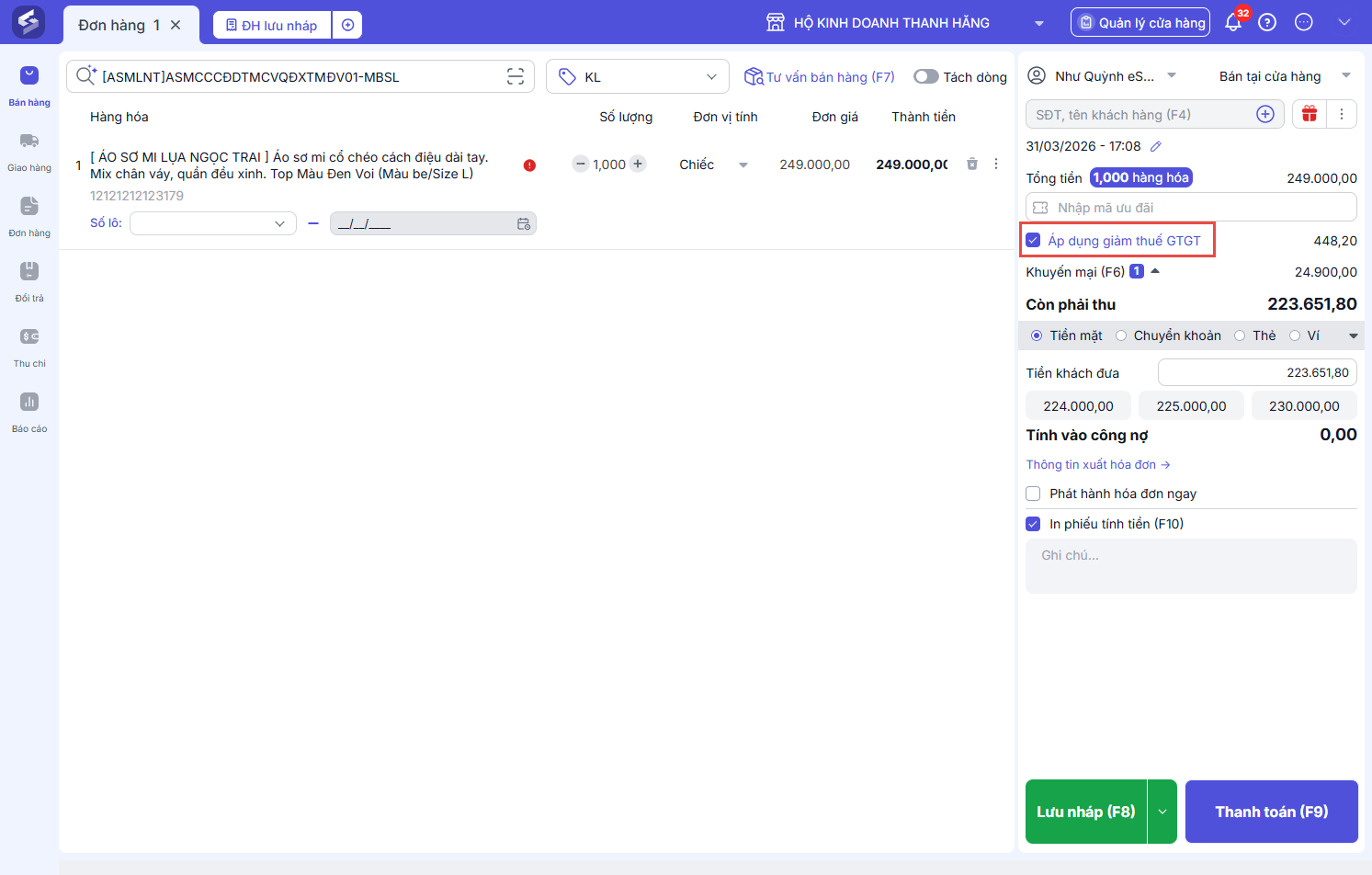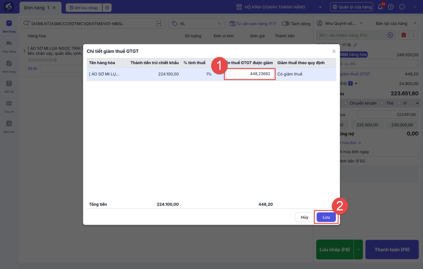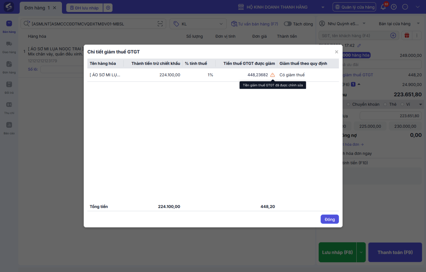 Tại màn Bán tại cửa hàng, sau khi thêm hàng hóa, với các hàng hóa có áp dụng Giảm thuế GTGT, hệ thống sẽ tính toán Tiền thuế GTGT được giảm: