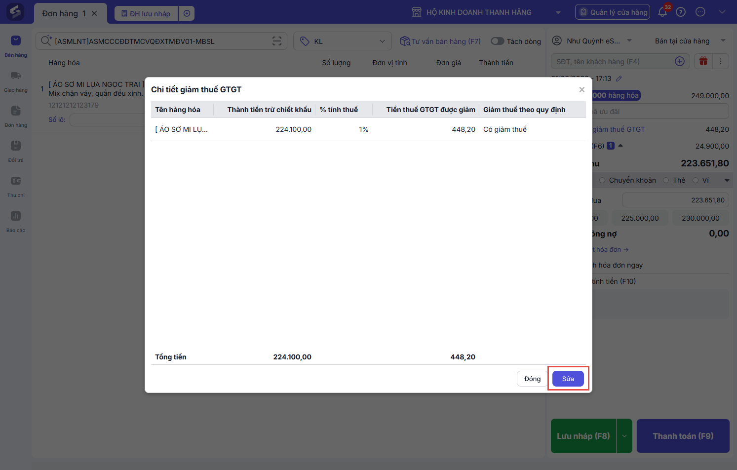 Tương tự như vậy, với các đơn hàng đã hoàn thành, người dùng có thể thực hiện sửa tiền giảm thuế tại tính năng Sửa đơn hàng: