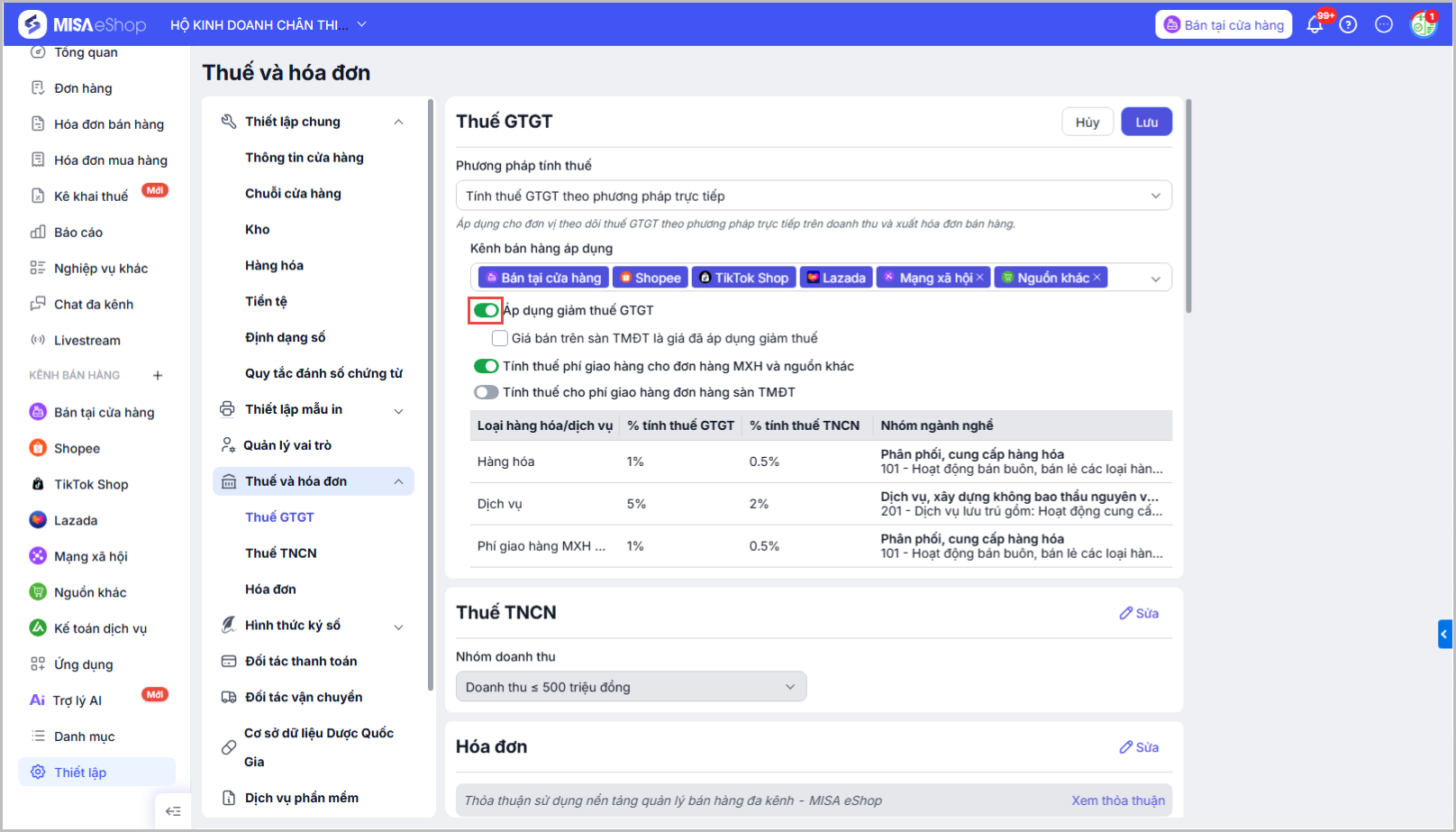 Bật tính năng Áp dụng giảm thuế GTGT: Khi bật tính năng, người dùng có thể sửa thông tin Tiền giảm thuế theo từng dòng hàng hóa.