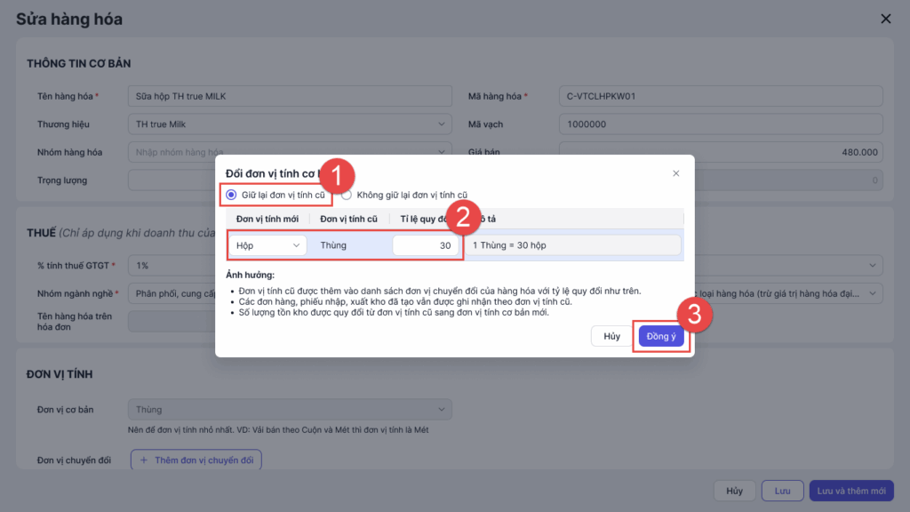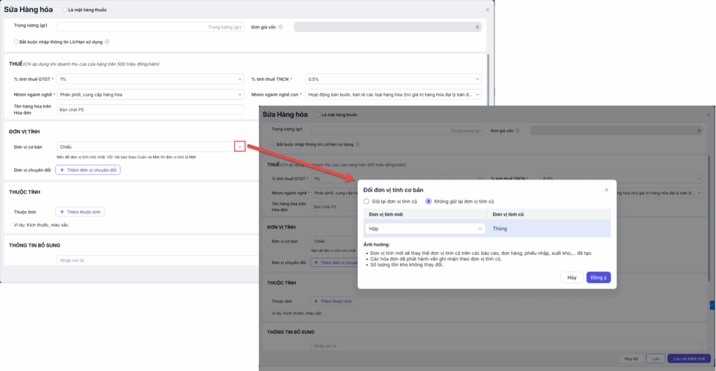 Lưu ý: Các ảnh hưởng sau khi sửa đơn vị tính hàng hóa: