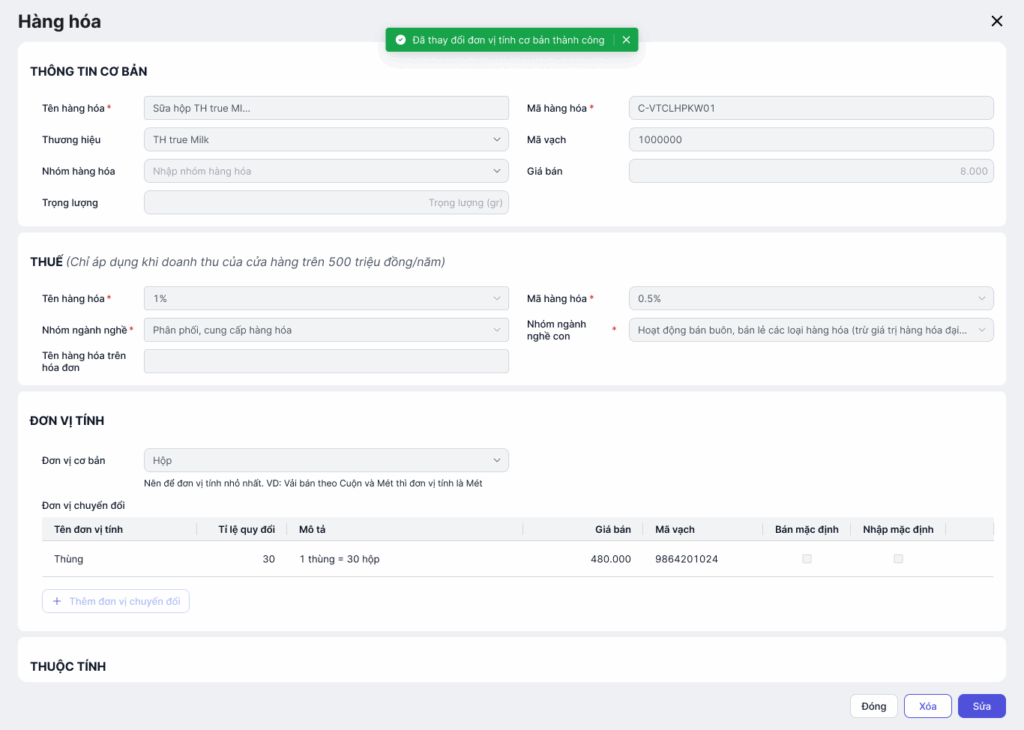 - Sau khi nhấn Đồng ý: Tại màn hàng hóa đơn vị tính sẽ được đổi sang đơn vị tính mới, không thay đổi các thông tin khác (như giá bán, mã vạch, …).