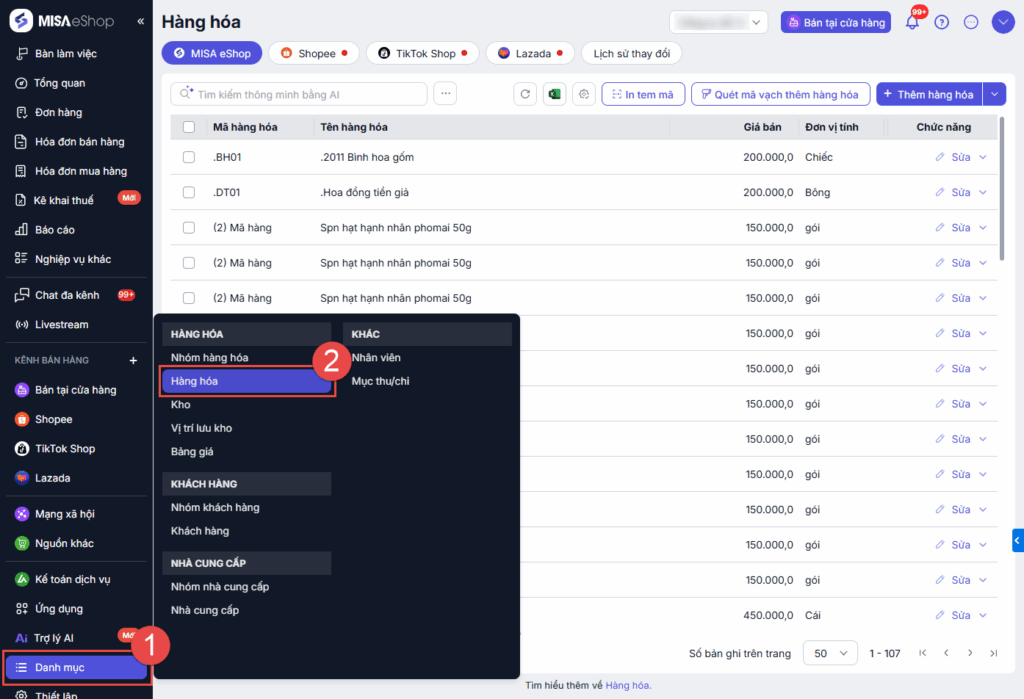Bước 1: Tại màn hình trang Tổng quan, chọn Danh mục\Hàng hóa
