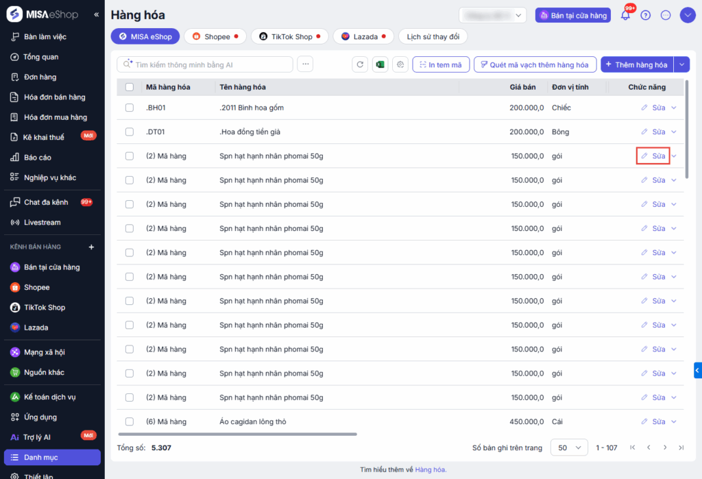 Bước 2: Tại hàng hóa cần sửa, nhấn Sửa