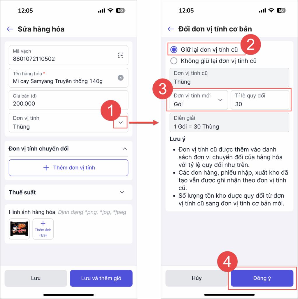 Bài viết hướng dẫn cách thiết lập để sử dụng đơn vị tính nhỏ hơn đơn vị cơ bản giúp cửa hàng quản lý tồn kho và bán lẻ chính xác. Để làm được như vậy, người dùng thực hiện sửa đơn vị tính cơ bản của hàng hóa theo một trong hai phương án: đổi đơn vị tính và không giữ lại đơn vị cũ, hoặc đổi và giữ lại đơn vị cũ làm đơn vị chuyển đổi.