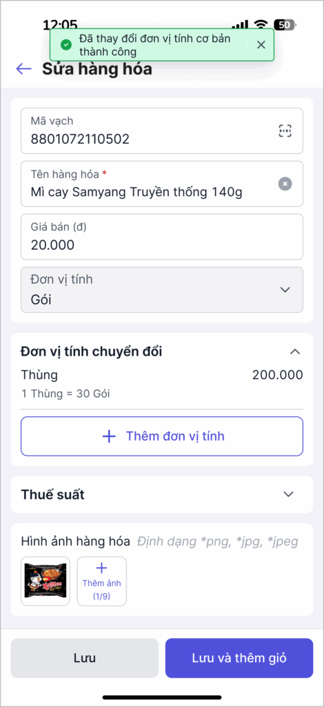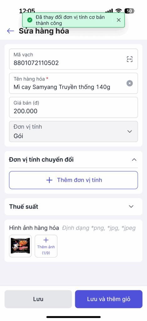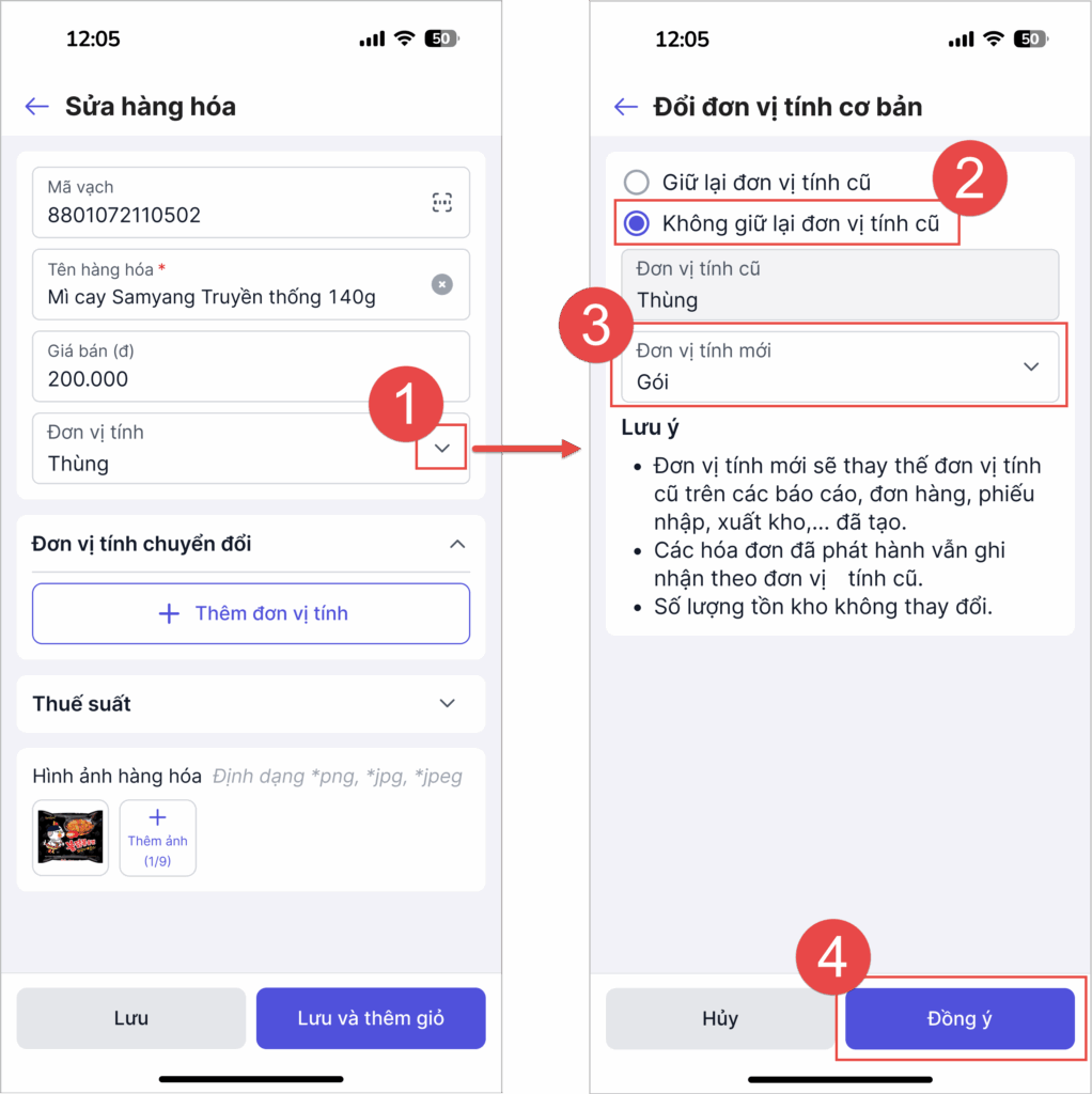 - Sau khi nhấn Đồng ý: Tại màn hàng hóa đơn vị tính sẽ được đổi sang đơn vị tính mới, không thay đổi các thông tin khác (như giá bán, mã vạch, …).