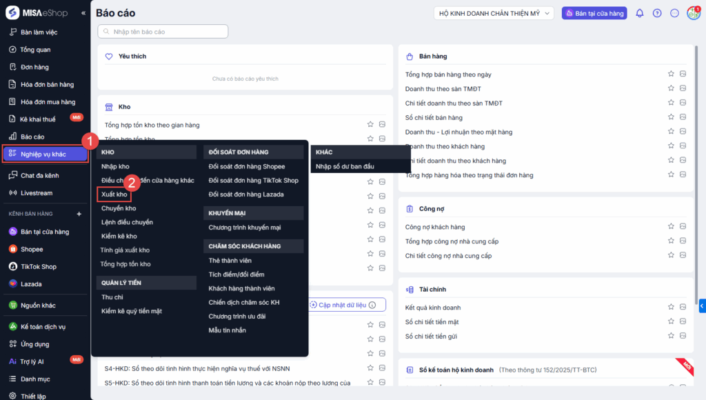 Bước 1: Tại màn hình Tổng quan, chọn Nghiệp vụ\Xuất kho
