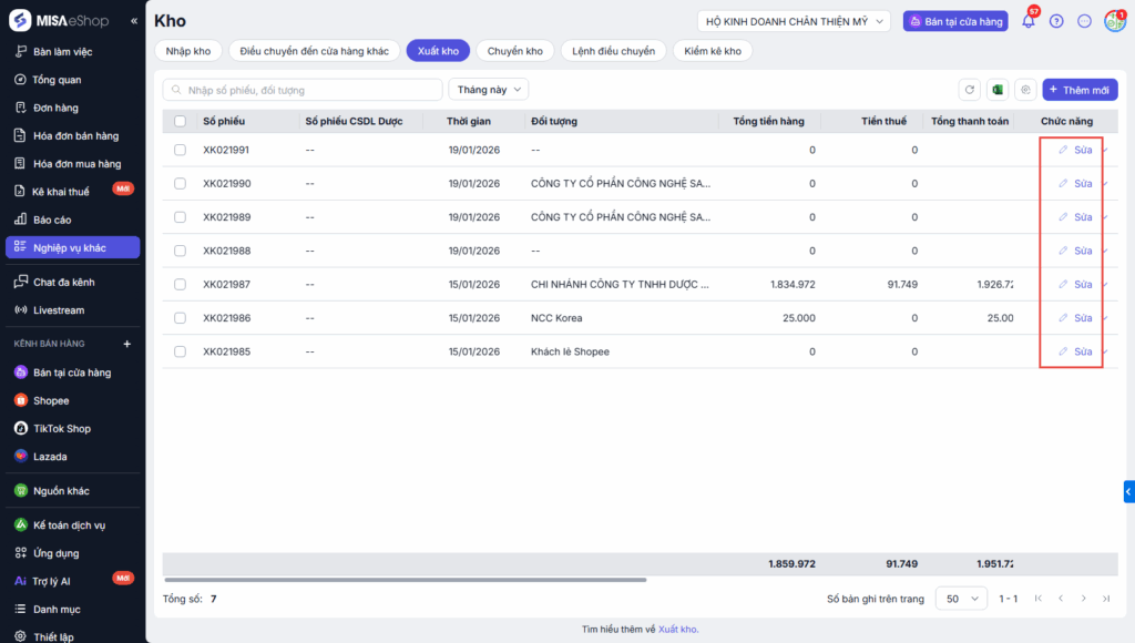 Bước 2: Tìm kiếm phiếu xuất kho cần sửa, chọn chức năng Sửa