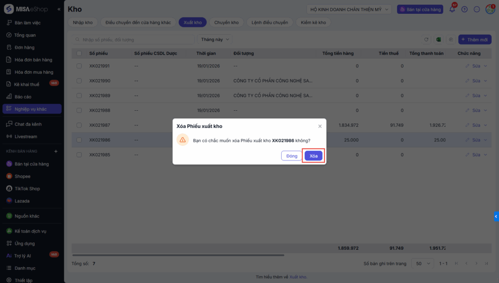 2.2 Xóa phiếu xuất kho
