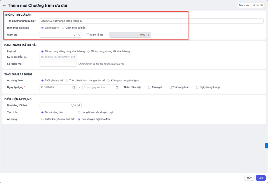 - Tên chương trình ưu đãi (Bắt buộc): Nhập tên chương trình ưu đãi để dễ dàng nhận diện và quản lý.