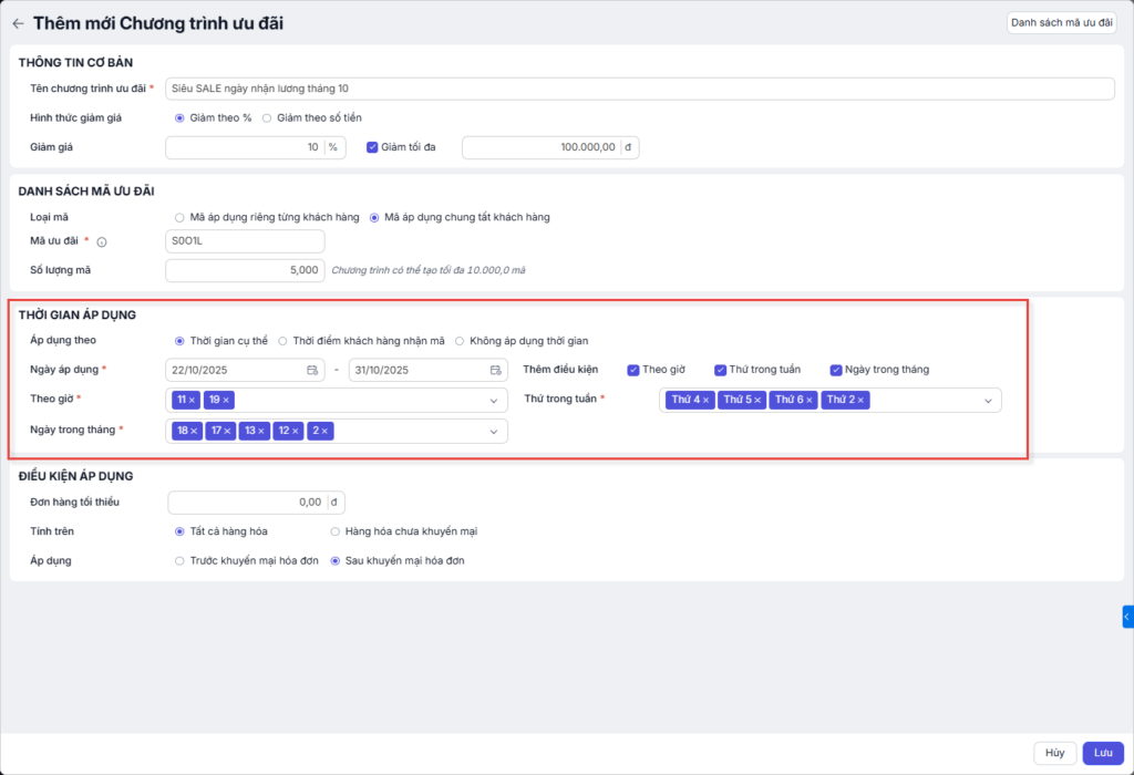 - Theo giờ: chọn khung giờ áp dụng mã.