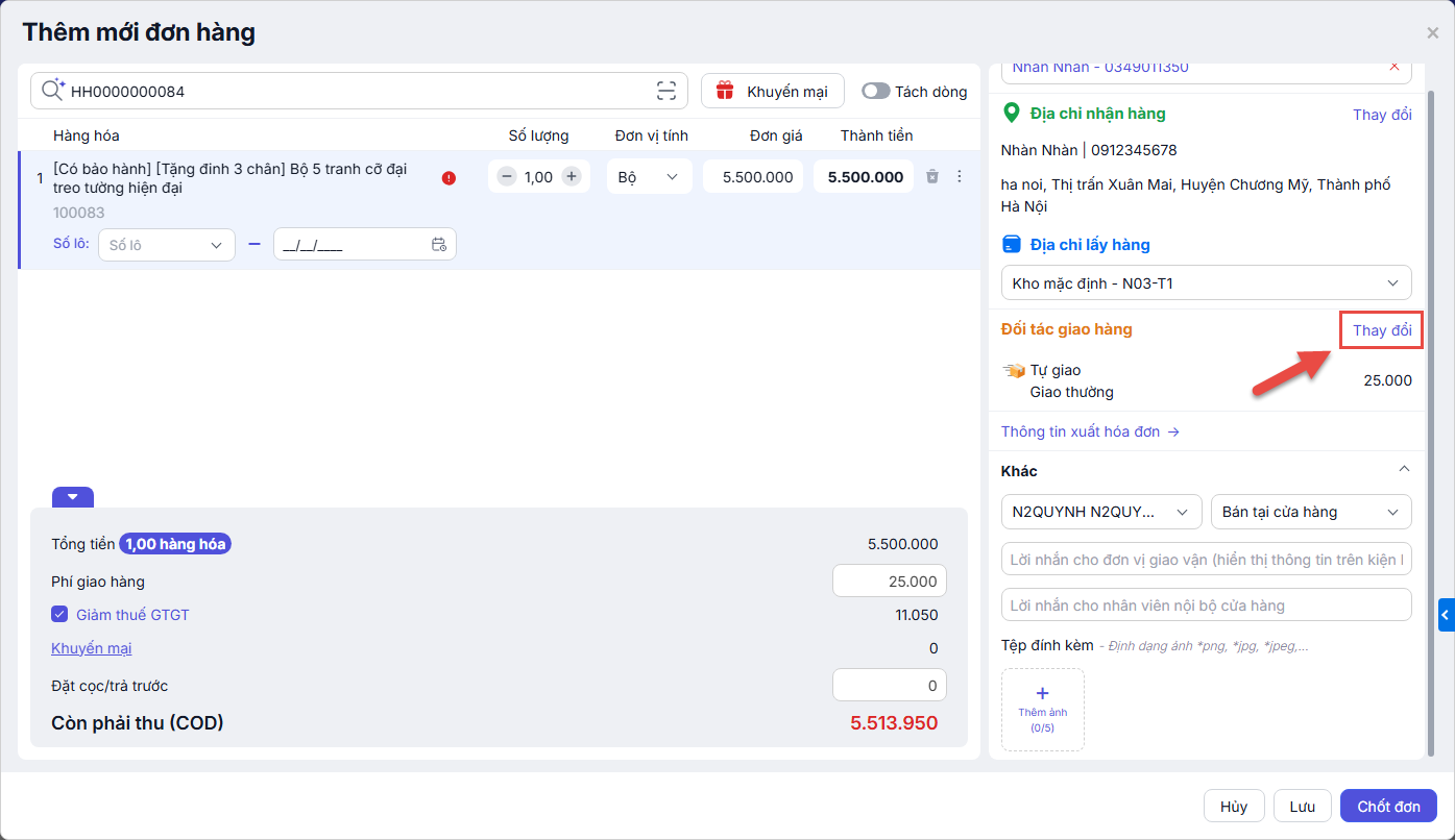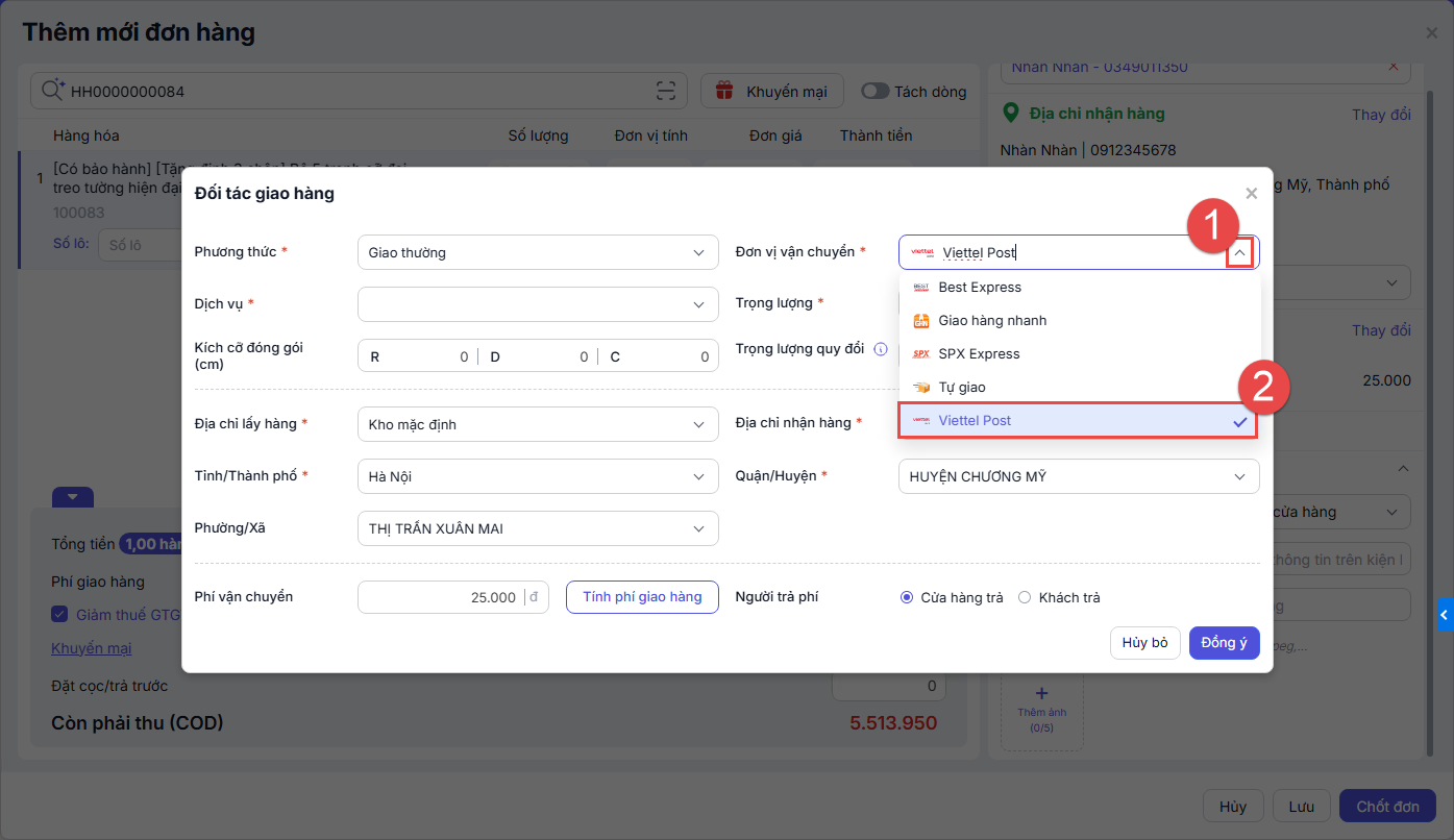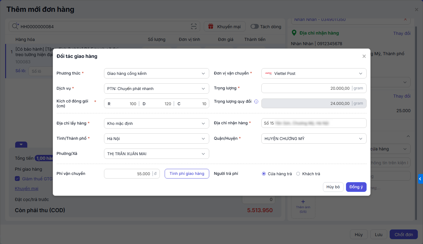 • Thông tin địa chỉ nhận hàng: Hệ thống lấy thông tin dựa trên thông tin khách hàng đã thêm trước đó (Khi chọn khách hàng), người dùng có thể sửa lại (Nếu cần).