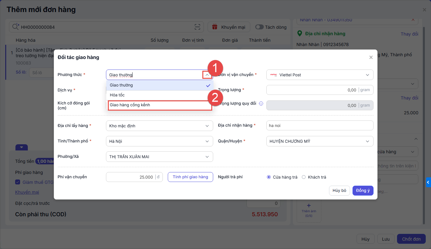 • Chọn Phương thức: Giao hàng cồng kềnh