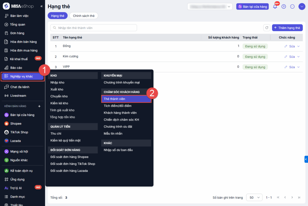 Bước 1: Chọn Nghiệp vụ khác\Thẻ thành viên