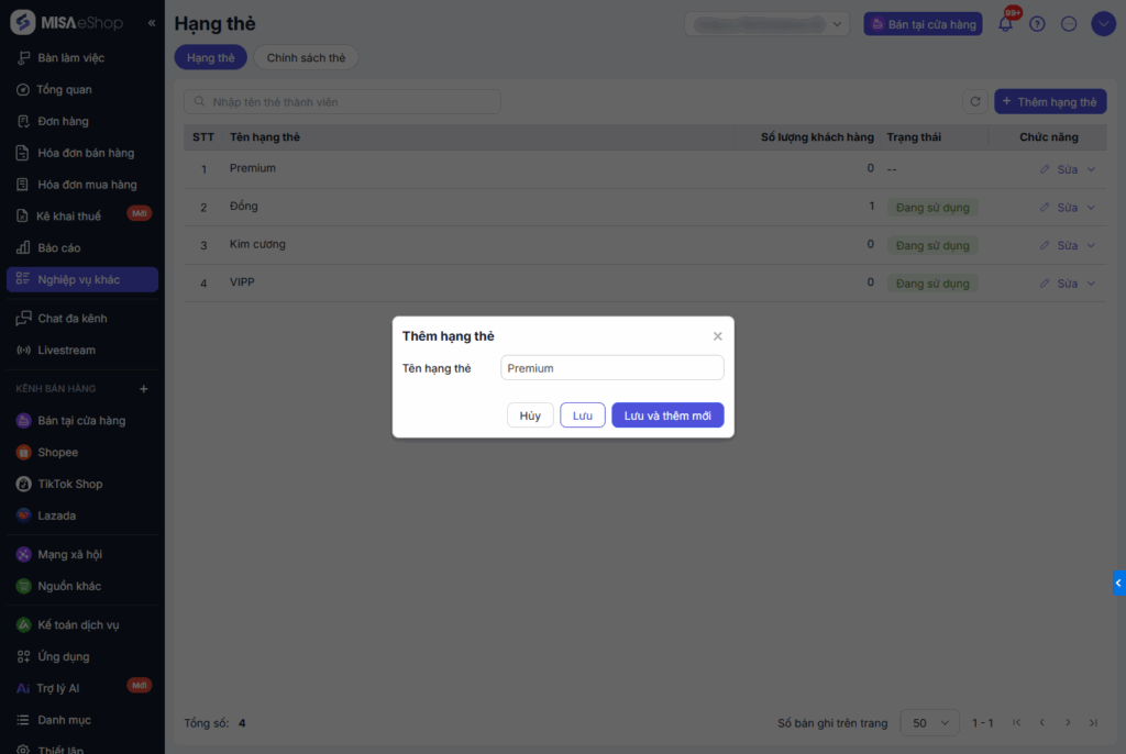 - Các hạng thẻ đã gắn với khách hàng: Không thể xóa hạng thẻ