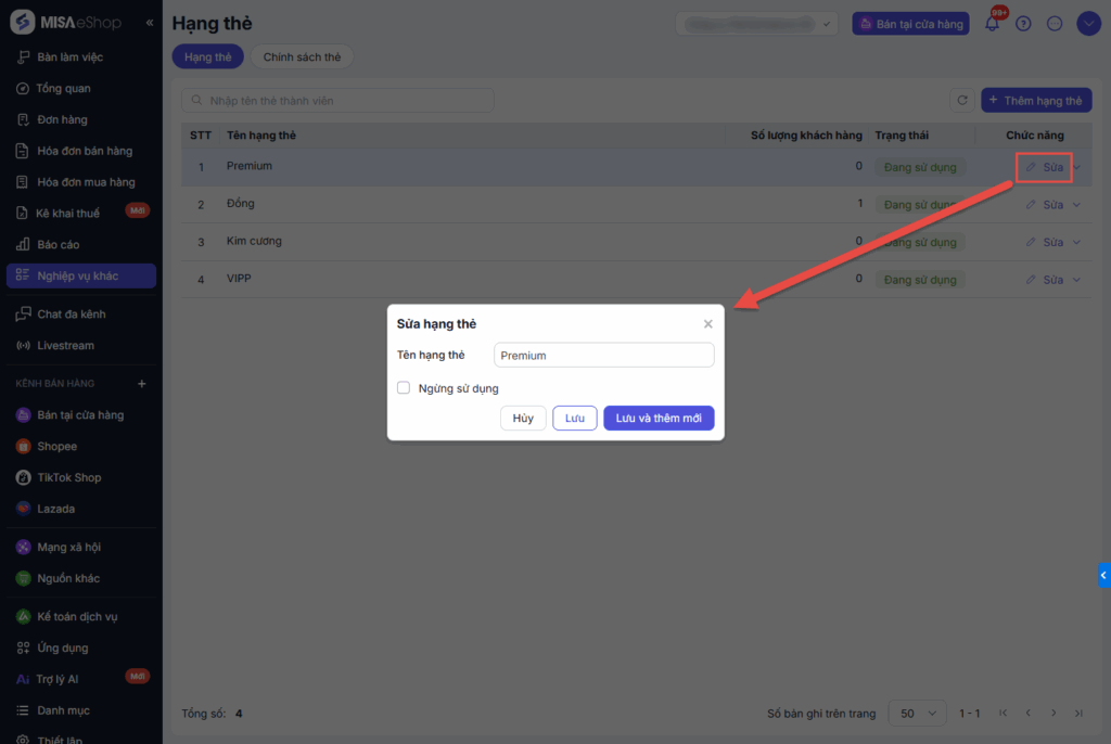 Tại danh sách hạng thẻ, chọn chức năng Sửa.