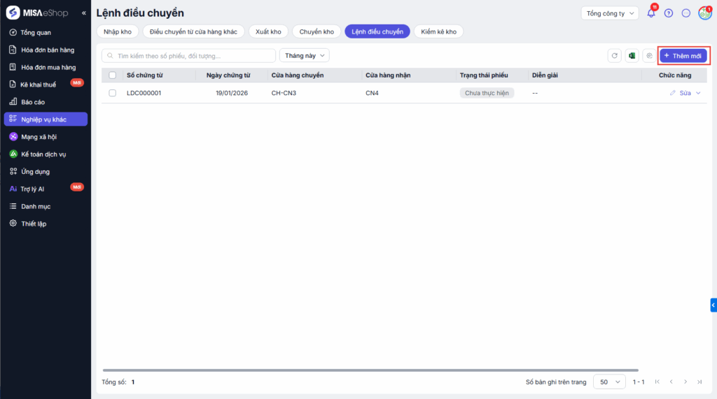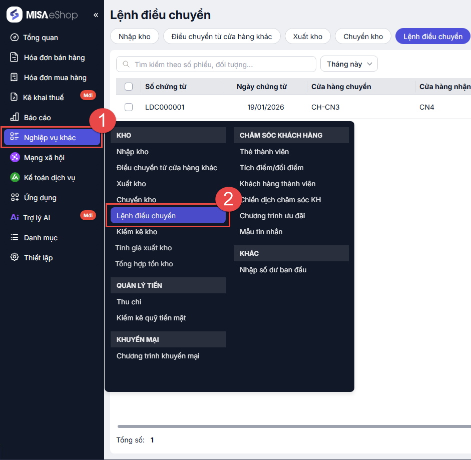 Tính năng Lệnh điều chuyển cho phép thực hiện tạo phiếu luân chuyển hàng hóa giữa các cửa hàng thuộc Tổng công ty giúp chứng minh nguồn gốc hàng hóa trong vận chuyển, lưu thông và quản lý nội bộ.