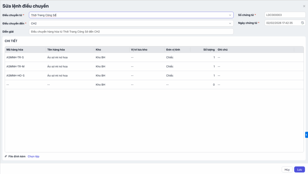 - Có thể sửa lại ngày lập chứng từ, tuy nhiên ngày điều chuyển phải nhỏ hơn hoặc bằng ngày hiện tại.