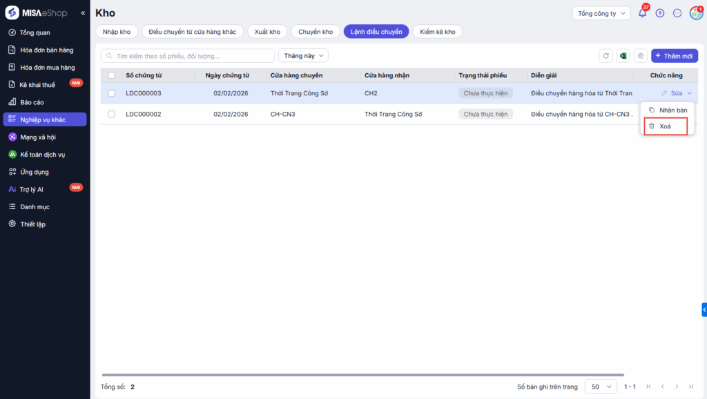 - Không thể xóa lệnh điều chuyển khi đã phát sinh phiếu xuất kho.
