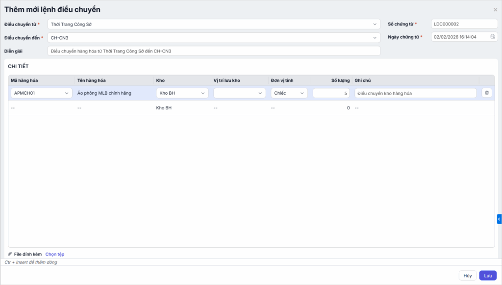 - Số lượng (Bắt buộc): Số lượng điều chuyển không được lớn hơn số lượng tồn của hàng hóa tại kho đã chọn.
