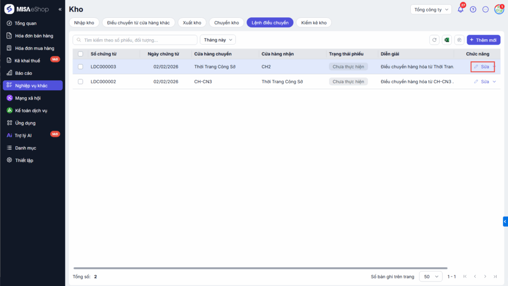 - Tại màn danh sách lệnh điều chuyển, nhấn Sửa tại phiếu lệnh điều chuyển cần sửa.