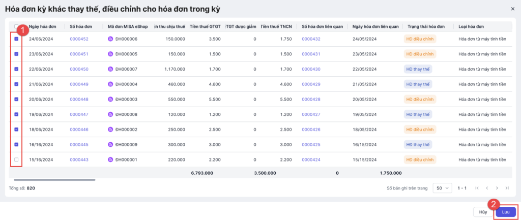 - Nhấn Tích chọn/Bỏ chọn hóa đơn điều chỉnh, thay thế cho hóa đơn gốc của kỳ khác, sau đó nhấn Lưu.