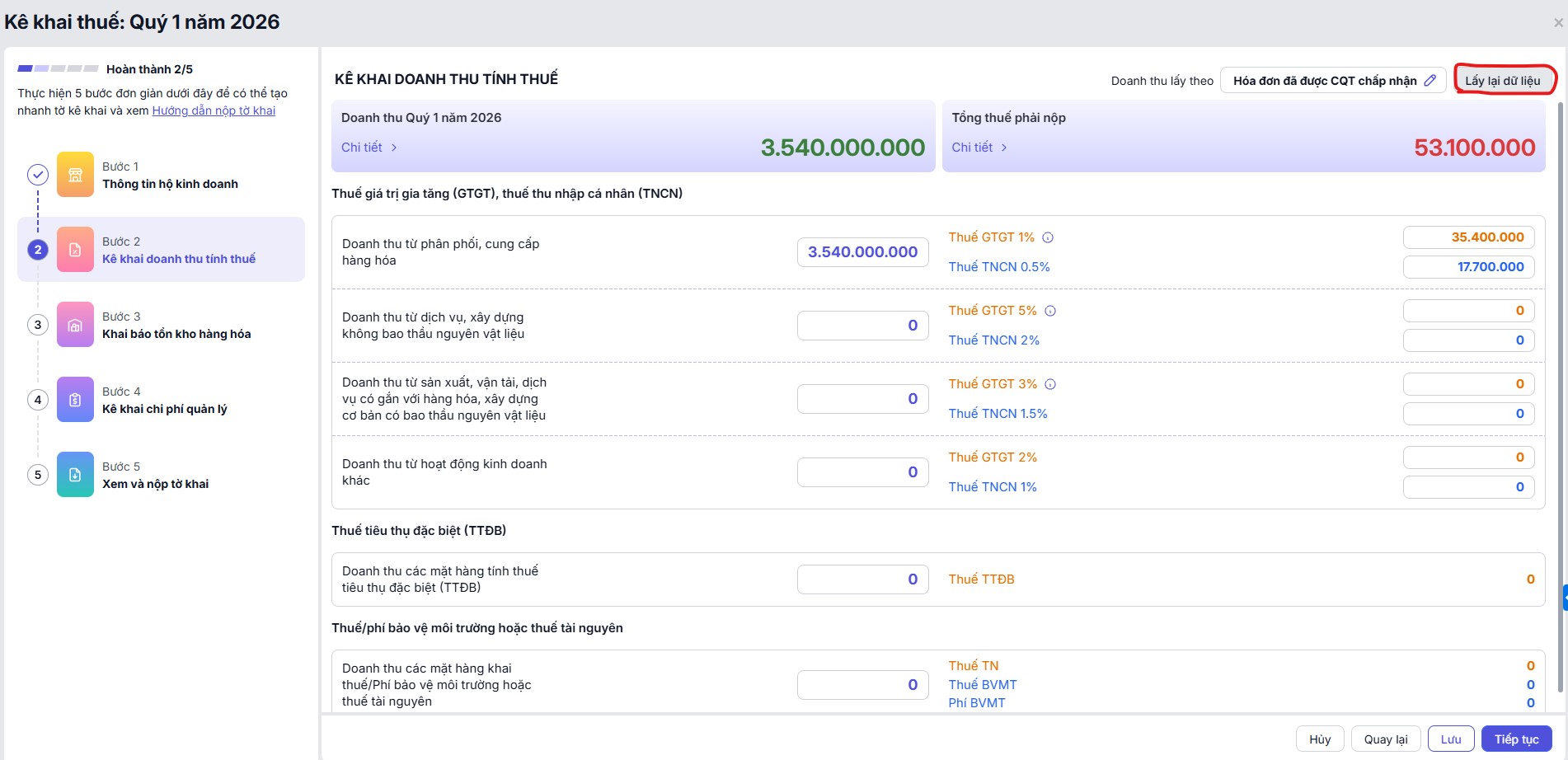 → Xử lý: Tại Bước 2 > Bấm Sửa > Góc phải trên cùng chọn Lấy lại dữ liệu.