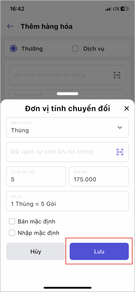 Nhập các thông tin đơn vị tính chuyển đổi → Nhấn Lưu để hoàn tất.