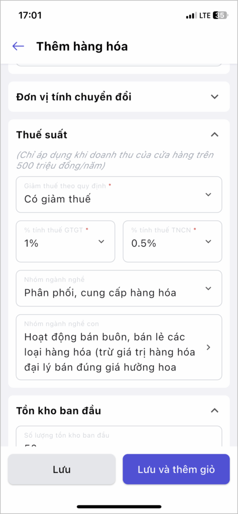 - Thông tin thuế: Hệ thống sẽ tự động thêm thuế mặc định đã được thiết lập sẵn, có thể thực hiện điều chỉnh thuế cụ thể cho từng sản phẩm nếu cần.