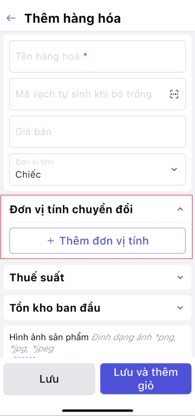 - Tại mục đơn vị tính chuyển đổi chọn Thêm đơn vị tính
