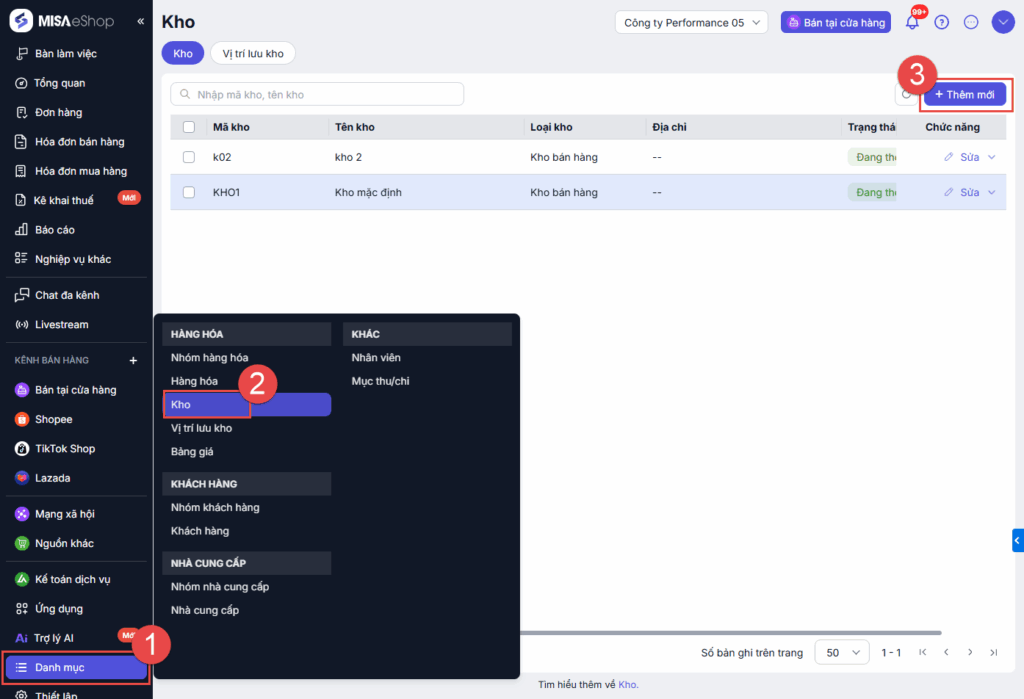 Bước 1: Tại màn hình Tổng quan, chọn Danh mục\Kho, nhấn Thêm mới
