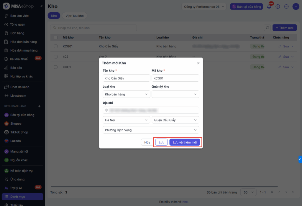 - Địa chỉ: Khai báo địa chỉ địa lý của kho.