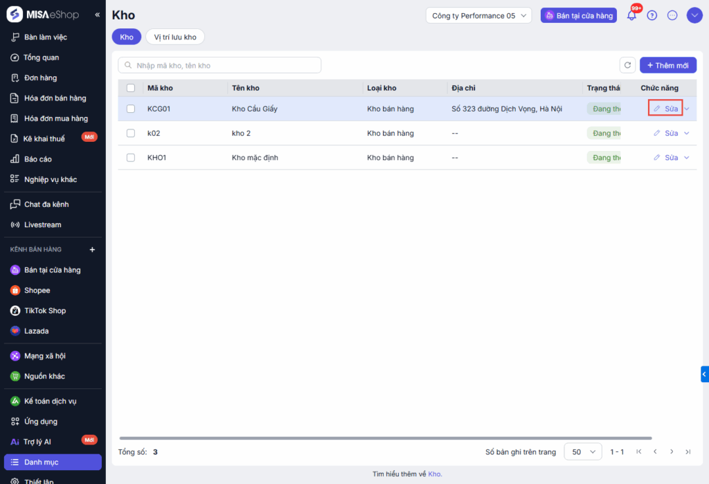 Tại danh sách kho, chọn chức năng Sửa tại kho cần sửa và tiến hành sửa với quy tắc tương tự khi thêm mới.