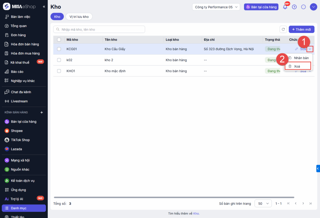 Tại danh sách kho, chọn chức năng Xóa tại kho cần xóa.