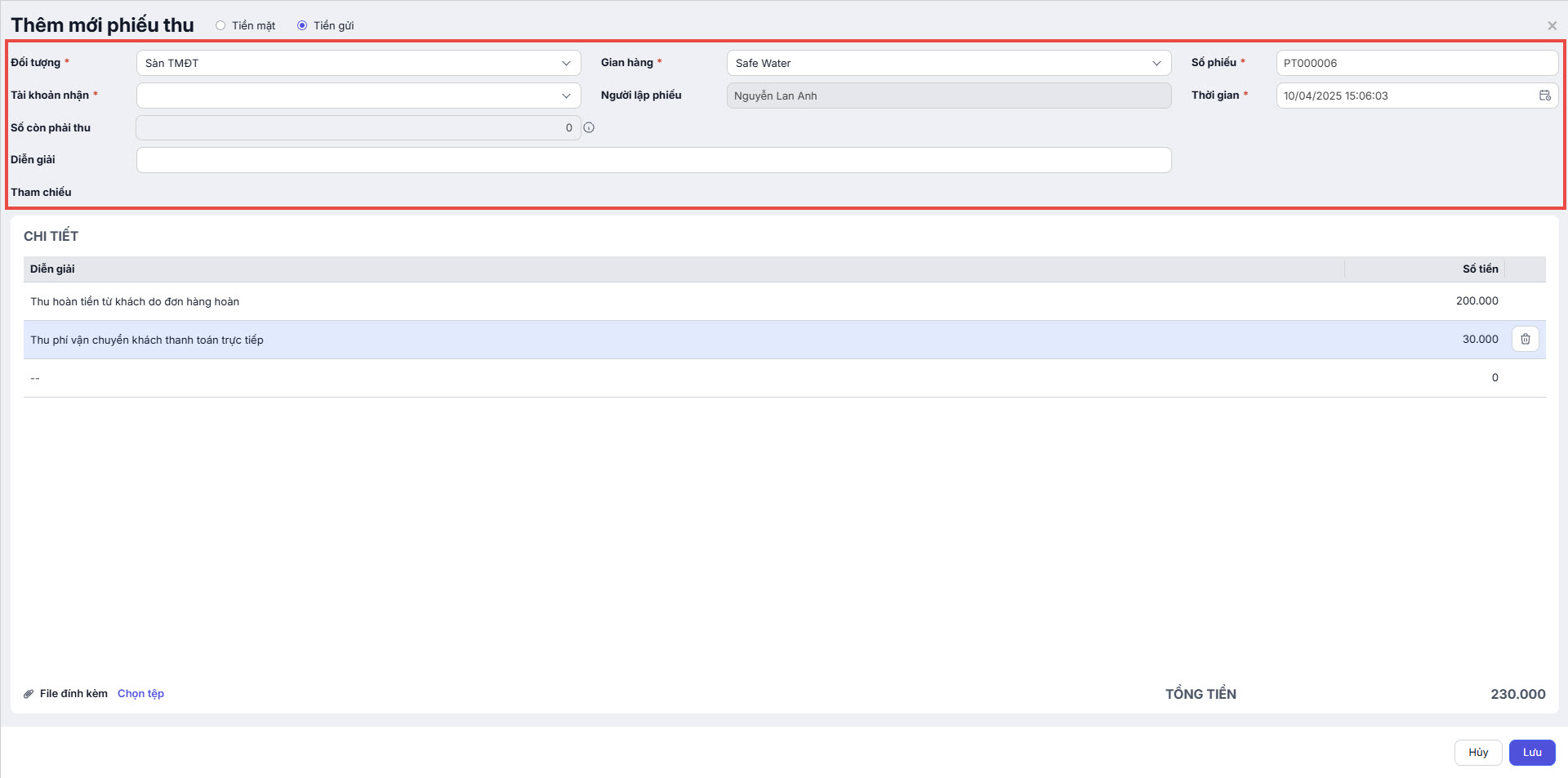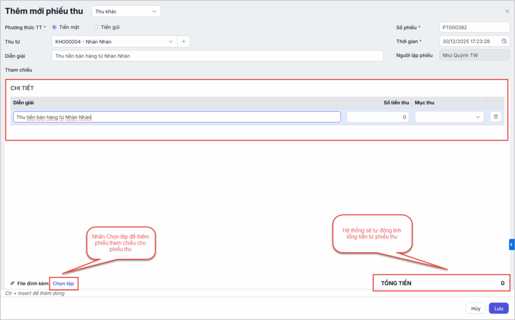 - Sau khi hoàn tất nhập liệu, nhấn Lưu để ghi nhận phiếu thu vào hệ thống.