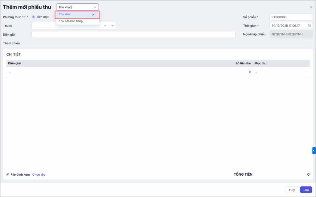 Chọn Thu Khác và nhập thông tin chung của phiếu thu:
