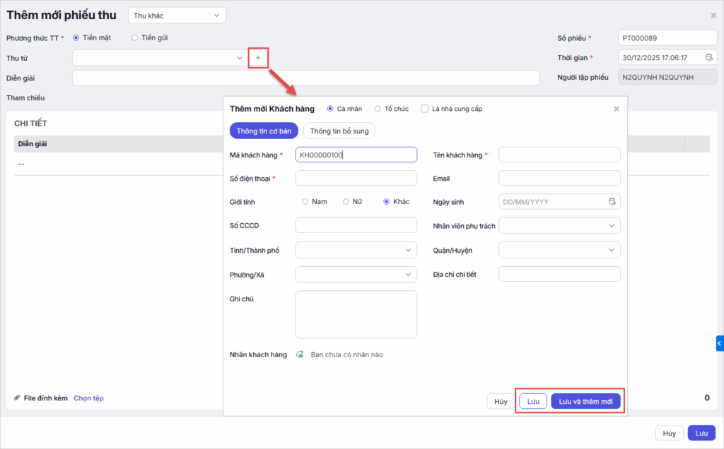và nhập thông tin → Nhấn Lưu/Lưu và thêm mới.