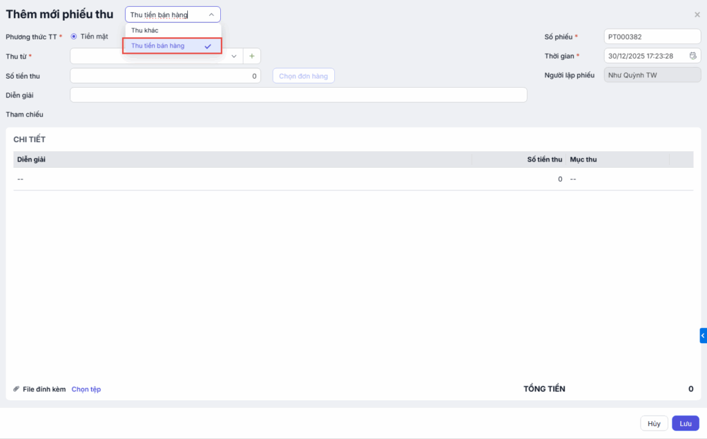 Chọn Thu tiền bán hàng và nhập thông tin chung của phiếu thu: