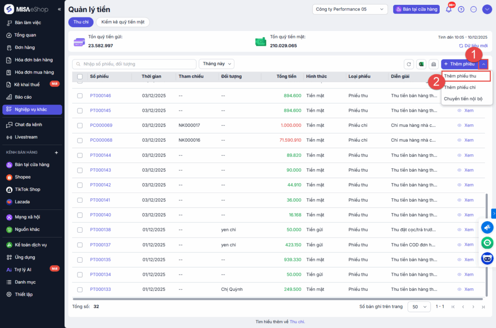 Bước 2: Nhấn mũi tên trỏ xuống ở cạnh nút Thêm phiếu → chọn Thêm phiếu thu.