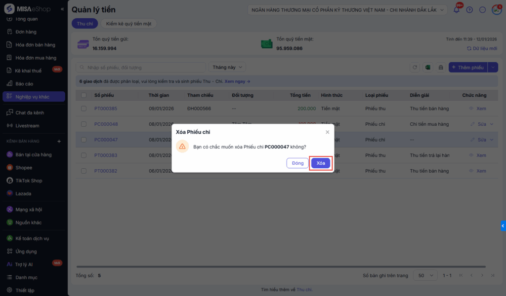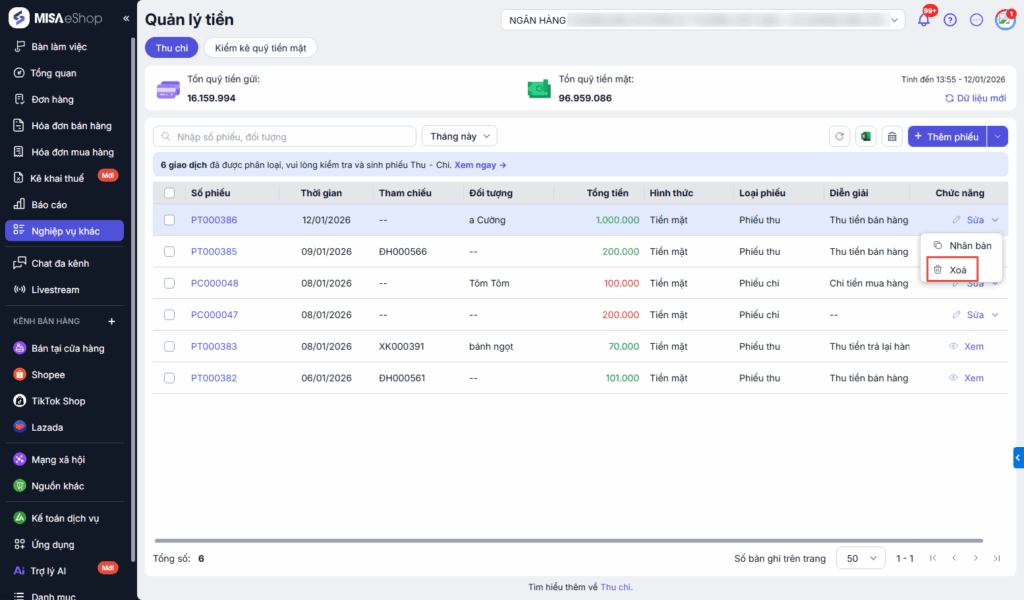 - Trong danh sách phiếu Thu chi, tại phiếu thu cần xóa, chọn chức năng Xóa.