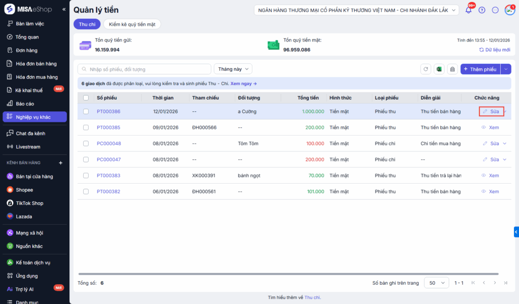 - Trong danh sách phiếu Thu chi, tại phiếu thu cần sửa, chọn chức năng Sửa.