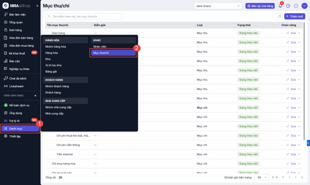 Bước 1: Tại màn hình quản lý, chọn Danh mục → Mục Thu/Chi