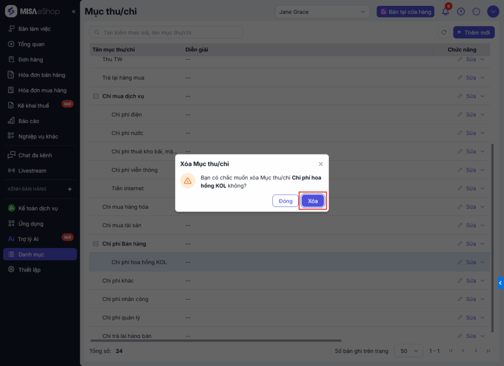 2.3 Xóa Mục thu/chi